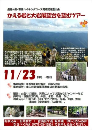 美山周辺情報 美山の長老山を音海から登る!南丹市美山町音海集落の 『かえる岩と大岩展望台を望むツアー』が開催されます 11月23日(木)祝日 続きを読む 投稿者:pani 投稿日時:8年2017年11月7日前